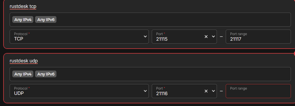 21116 (TCP/UDP): Please note that 21116 should be enabled both for TCP and UDP. 21116/UDP is used for the ID registration and heartbeat service. 21116/TCP is used for TCP hole punching and connection service.