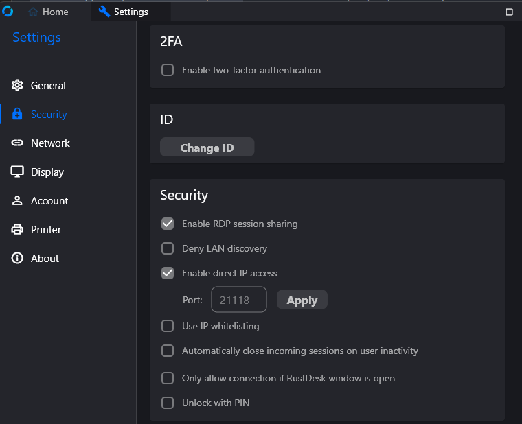 - Edit the rustdesk settings -> Security -> Check Enable direct IP